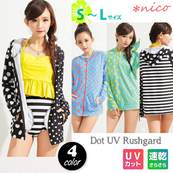 [メール便不可]【送料無料※沖縄は追加送料】ドット×ボーダー柄切り替え★長袖パーカータイプラッシュガード(YYF1412)【水着】【レディース】