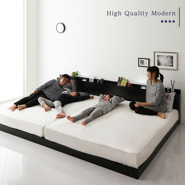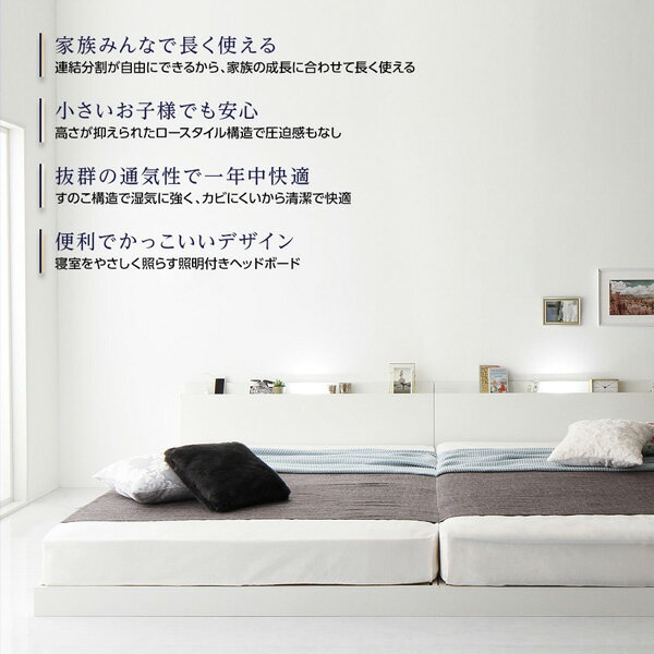 ■サイズ・色違い・関連商品 セミシングル(81cm/SS)シングル(98cm/S) フレームのみ マットレス付き(2種)フレームのみ マットレス付き(2種) セミダブル(121cm/SD)ダブル(141cm/D) フレームのみ マットレス付き(2種)フレームのみ マットレス付き(2種) クイーン(160cm/SS+SS)キング(180cm/SS+S) フレームのみ マットレス付き(2種)フレームのみ マットレス付き(2種) Wキング(200cm/S+S) Wキング(220cm/S+SD) フレームのみ マットレス付き(2種)フレームのみ マットレス付き(2種) Wキング(240cm/S+D)Wキング(240cm/SD+SD) フレームのみ マットレス付き(2種)フレームのみ マットレス付き(2種) Wキング(260cm/SD+D) Wキング(280cm/D+D) フレームのみ マットレス付き(2種)フレームのみ マットレス付き(2種)■商品内容【高級モダンの象徴/High Quality Modern】 1:家族みんなで長く使える 連結分割が自由にできるから、家族の成長に合わせて長く使える 2:小さいお子様でも安心 高さが抑えられたロースタイル構造で圧迫感もなし 3:抜群の通気性で一年中快適 すのこ構造で湿気に強く、カビにくいから清潔で快適 4:便利でかっこいいデザイン 寝室をやさしく照らす照明付きヘッドボード【家族みんなで長く使える】 連結分割が自由にできるから、家族の成長に合わせて長く使える ・家族構成が変化してもずっと一緒 ・ベルトタイプだから工具不要で簡単しっかり連結 ・隙間なくピッタリ連結できるから家族みんなで安心して寝られる ・子どもが大きくなったら分割して使える【小さいお子様でも安心】 高さが抑えられたロースタイル構造だから圧迫感もなし ・フレームと床板の高さが同じだから使いやすく安全【抜群の通気性で一年中快適】 すのこ構造で湿気に強く、カビにくいから清潔で快適 ・LVLすのこで強度抜群 ・フレーム内側にEVAテープ ・開き止めバーでゆがみにくく頑丈 開き止めバーは金属プレートで固定 ※SD、Dサイズのみセンターに補強桟あり【便利でかっこいいデザイン】 寝室をやさしく照らす照明付きヘッドボード ・間接照明がお部屋を淡く照らす就寝時に便利なLED照明付き ・就寝時もまぶしくない 上向きに設置された照明はお部屋をやさしく照らし、就寝時もまぶしくない。