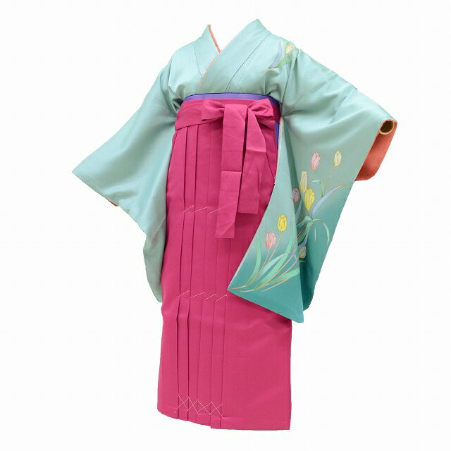 【中古】 二尺袖 袴 卒業式 女の子 / リサイクル着物 / 半幅帯 小学生 ジュニア 卒業式 謝恩会 3点セット 緑 チューリップ文様 身丈164cm 裄68.5cm ll2985b18 【着物ひととき】